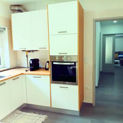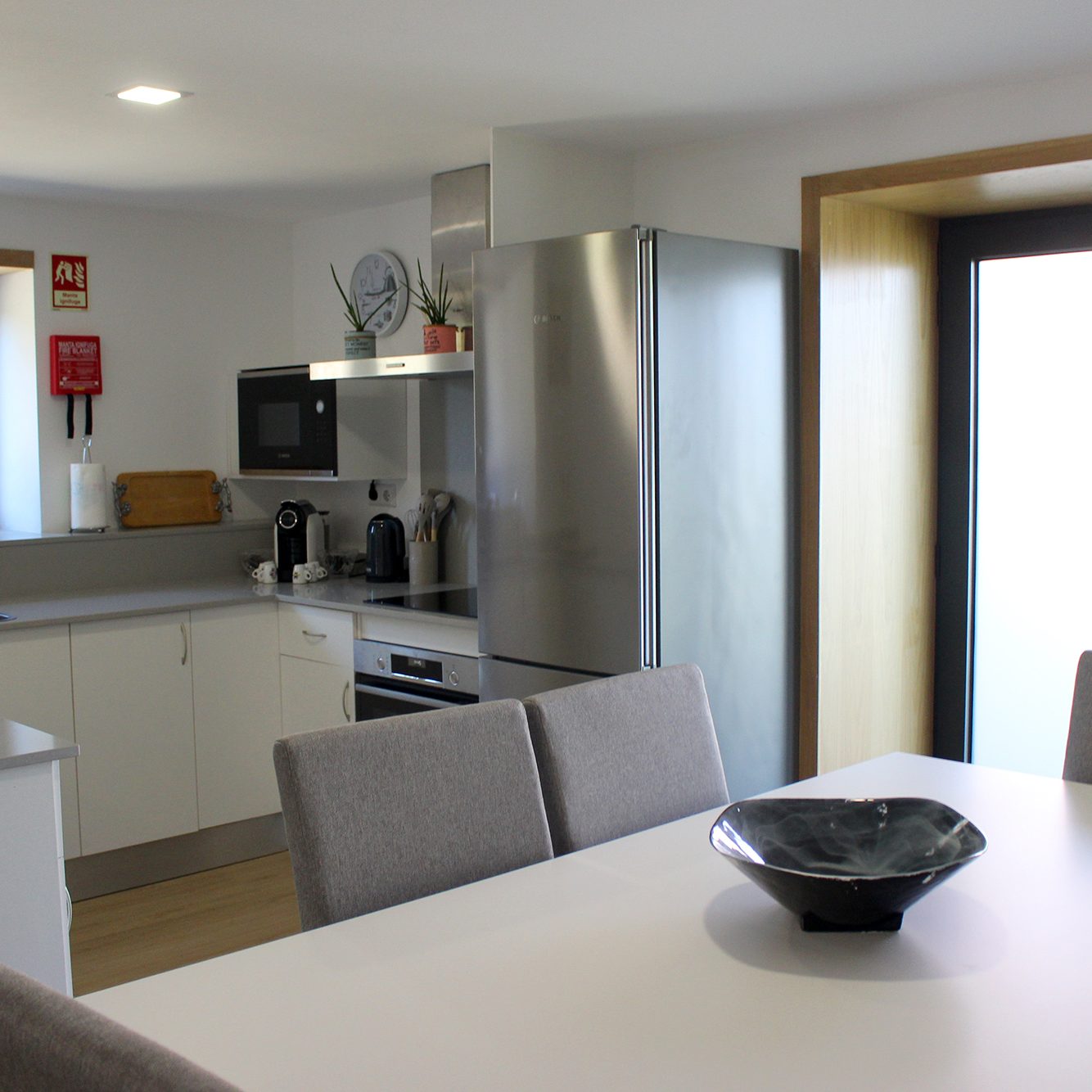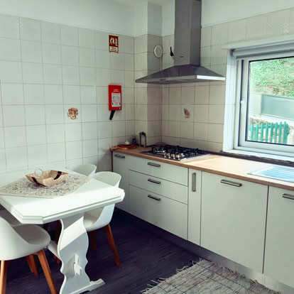 A sala de estar apresenta uma zona privilegiada do calor confortável do recuperador de calor, um sofá-cama para dois, num conceito de espaço aberto com a cozinha moderna e apetrechada com tudo o que necessita e mesa de refeições.